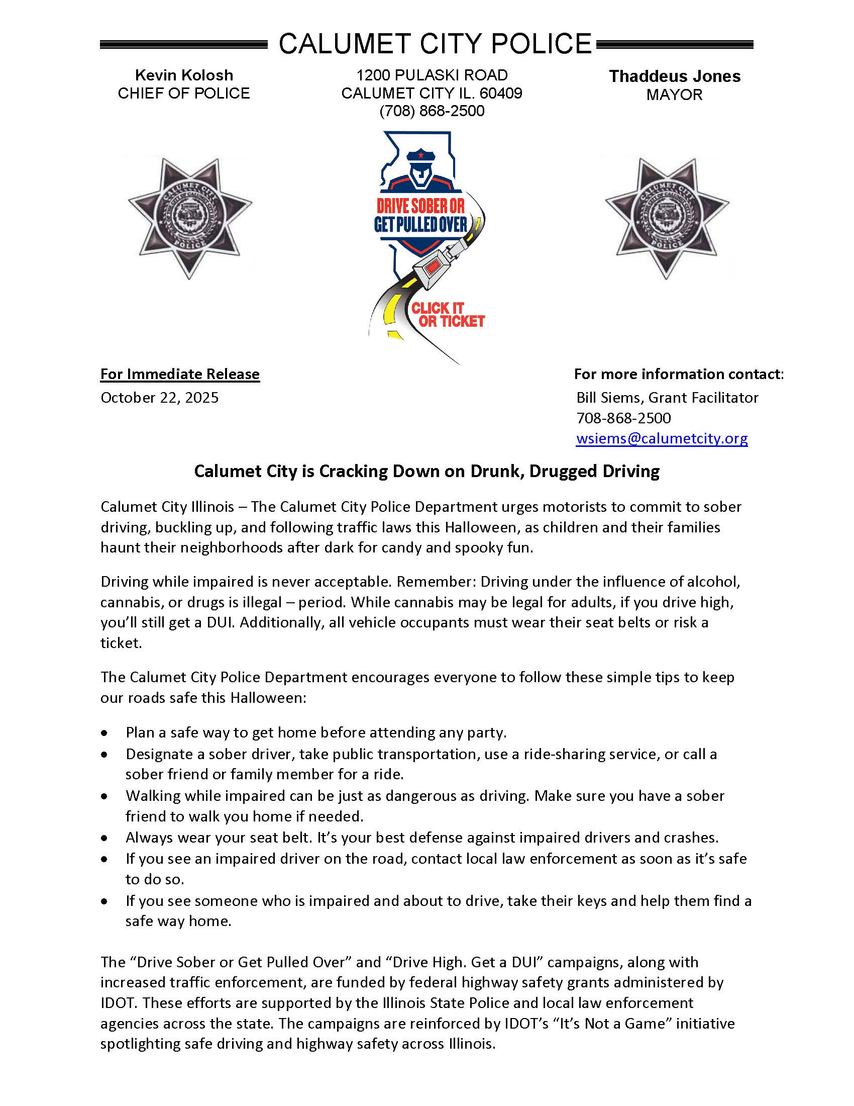 Calumet City, IL – The Calumet City Police Department urges motorists to commit to sober driving, buckling up, and following traffic laws this Halloween, as children and their families haunt their neighborhoods after dark for candy and spooky fun.