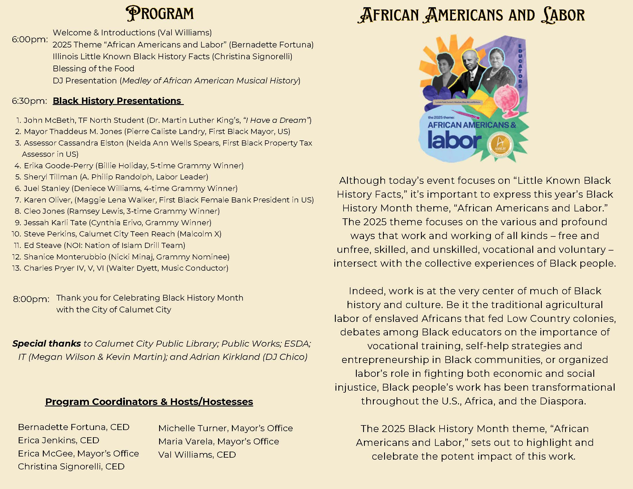 Join us as we bring the Calumet City Black History Month Calendar to life through skits, poems, monologues, performances, etc.