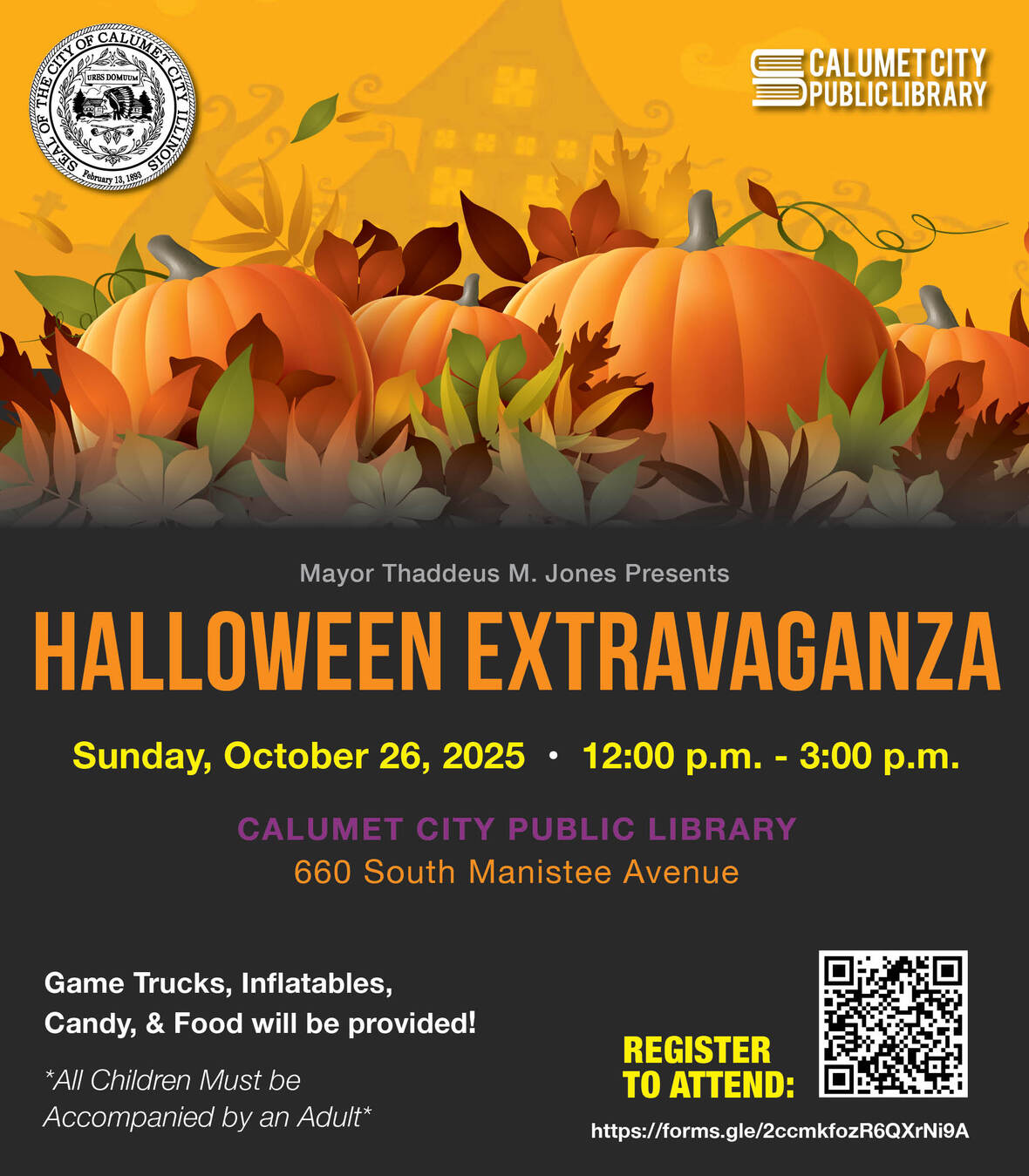 Mayor Thaddeus Jones invites you to attend the annual ‘Halloween Extravaganza’ on Sunday, October 26th, at the Calumet City Public Library located at 660 South Manistee Avenue.